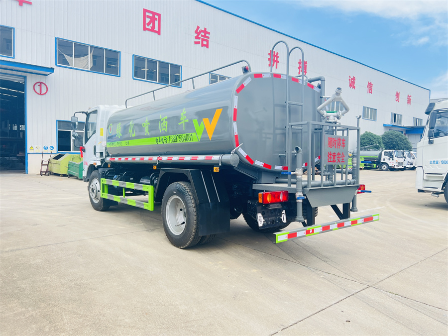 灑水車前裝有鴨形噴嘴或圓頭沖嘴,后面裝有圓柱開灑水噴嘴或蓮蓬頭噴嘴,后部有一工作平臺,裝配有水炮。后部還可裝8個(gè)噴嘴(選裝)。