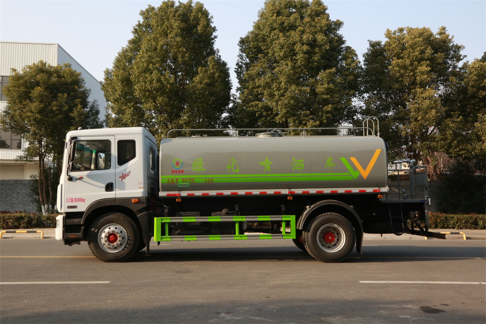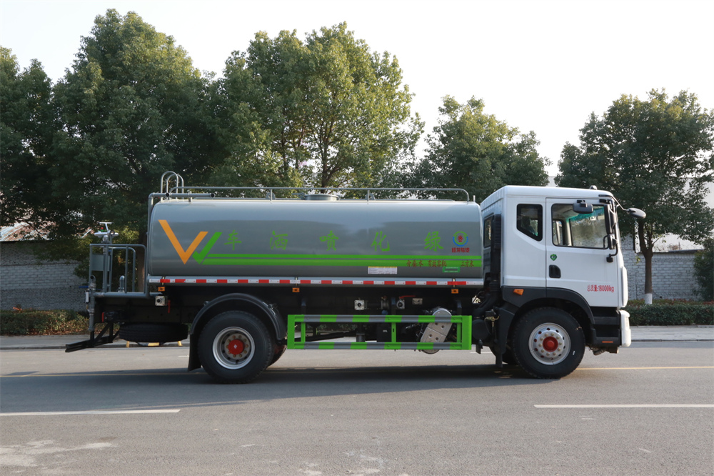 灑水車前裝有鴨形噴嘴或圓頭沖嘴,后面裝有圓柱開灑水噴嘴或蓮蓬頭噴嘴,后部有一工作平臺,裝配有水炮。后部還可裝8個(gè)噴嘴(選裝)。