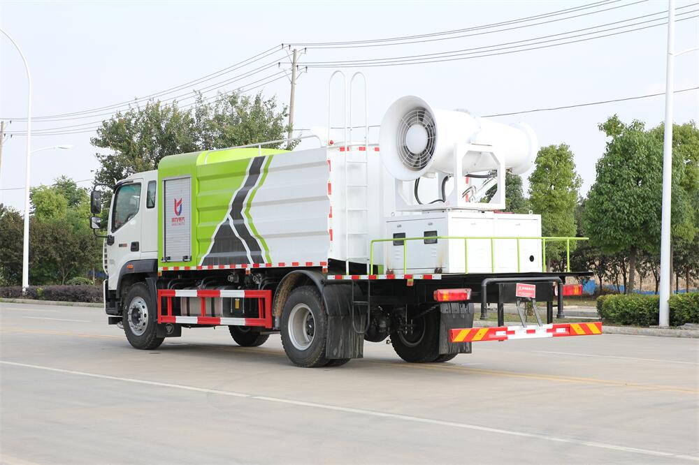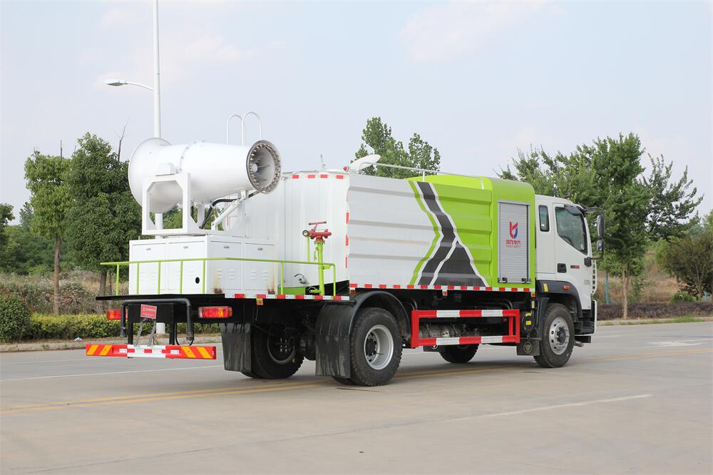 上裝配置:罐體容積為 12立方,選配風(fēng)送式霧炮機(jī)組射程30米、40米、50米、60米、80米、100米、120米霧炮,罐體鋼板為4mm碳鋼Q235材質(zhì),罐內(nèi)隔板具有防波作用,以減輕汽車行駛時罐體液體沖擊,罐體及整車外形尺寸按照公告。帶大功率專用灑水泵,泵可自吸自排,整車前沖、后灑、側(cè)噴、帶65消防接口,后平臺配CLW-50、CLW-60、CLW-80、CLW-100、CLW-120型風(fēng)送式霧炮機(jī)組;罐體前封頭配大功率柴油發(fā)電機(jī)組;前封頭帶水位計(jì),后平臺主管路帶1寸澆花接口,后爬梯。帶兩根輸水管及陰陽端。罐體顏色:銀/灰/綠,罐體兩側(cè)噴“多功能抑塵車”字樣,貼反光標(biāo)示。