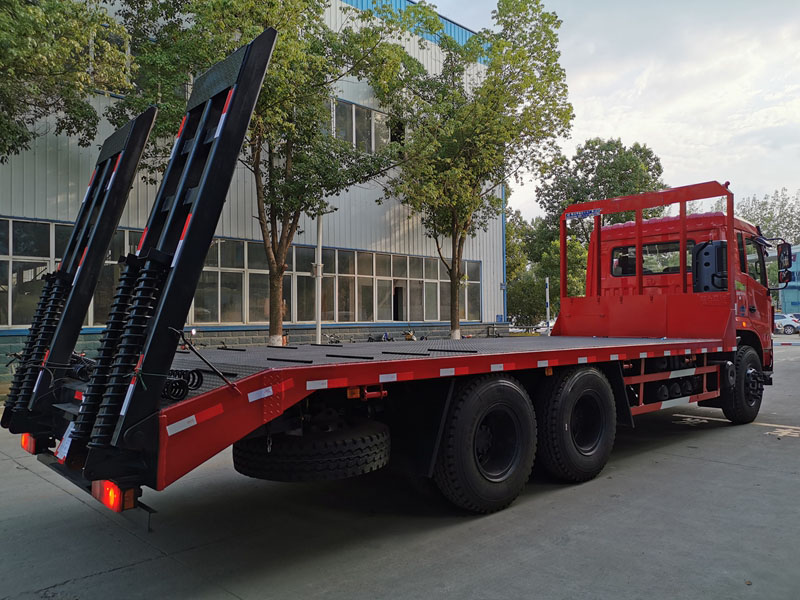 上裝采用八毫米花紋鋼板,120套100方管做橫梁,加強(qiáng)雙簧爬梯,可拉25噸-30噸以下挖機(jī)。