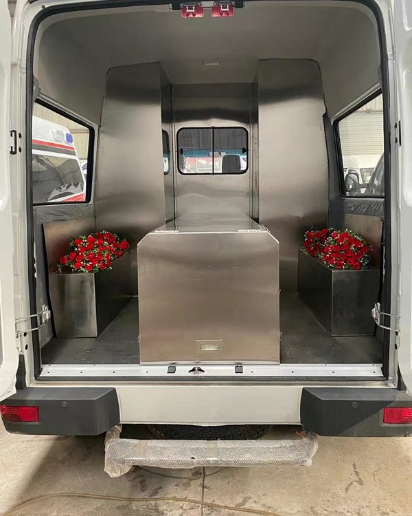 2. 改裝部分采用304L不銹鋼制作,中間不銹鋼隔墻安裝拉窗,不銹鋼地板,不銹鋼常溫棺不銹鋼擔(dān)架,加兩側(cè)玻璃下不銹鋼裝飾